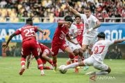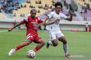 Pesepak bola Persis Solo Ramadhan Sananta (kiri) berebut bola dengan penjaga gawang Malut United FC Wagner Augusto Guimaraes Dos Santos (kiri) pada pertandingan BRI Liga 1 2024/2025 di Stadion Manahan, Solo, Jawa Tengah, Sabtu (12/4/2025). Persis Solo dikalahkan Malut United FC dengan skor 1-3. ANTARA FOTO/Mohammad Ayudha/YU