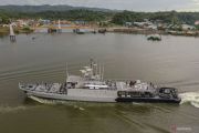 Foto udara KRI Tongkol-813 berlayar menuju kawasan pulau Wakatobi saat Ekspedisi Rupiah Berdaulat (ERB) 2025 di Pangkalan TNI AL, Kendari, Sulawesi Tenggara, Jumat (25/4/2025). Kantor Perwakilan Bank Indonesia (KPwBI) Sulawesi Tenggara bekerja sama dengan TNI AL mendistribusikan uang rupiah layak edar senilai Rp22 miliar menggunakan KRI Tongkol-813 menuju wilayah 3T di Sulawesi Tenggara yaitu Wanci, Kaledupa, Tomia, Binongko, dan Runduma. ANTARA FOTO/Andry Denisah/foc.