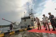 Kepala Departemen Pengelolaan Uang Bank Indonesia M. Anwar Bashori (tengah) bersama Sekretaris Daerah Sultra Asrun Lio (kiri), dan Paban II Ops Sopsal Kolonel Laut (P) Andri Kristianto (kanan) melepas KRI Tongkol-813 saat kick off Ekspedisi Rupiah Berdaulat (ERB) 2025 di Pangkalan TNI AL, Kendari, Sulawesi Tenggara, Jumat (25/4/2025). Kantor Perwakilan Bank Indonesia (KPwBI) Sulawesi Tenggara bekerja sama dengan TNI AL mendistribusikan uang rupiah layak edar senilai Rp22 miliar menggunakan KRI Tongkol-813 menuju wilayah 3T di Sulawesi Tenggara yaitu Wanci, Kaledupa, Tomia, Binongko, dan Runduma. ANTARA FOTO/Andry Denisah/foc.