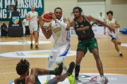 Pebasket Prawira Bandung Brandis Raley Ross (tengah) mencoba melewati pebasket Bima Perkasa Jogja Kierell Ardianus (kanan) pada pertandingan IBL 2025 di GOR Pancasila, Sleman, DI Yogyakarta, Sabtu (26/4/2025). Prawira Bandung menang dengan skor 82-53. ANTARA FOTO/Hendra Nurdiyansyah/wpa.