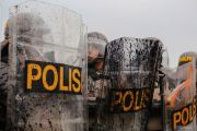 Polisi membubarkan pengunjuk rasa saat aksi Hari Buruh Internasional di depan Gedung DPR, Senayan, Jakarta, Kamis (1/5/2025). Pihak Kepolisian membubarkan pengunjuk rasa sekitar pukul 17.15 WIB usai sejumlah pengunjuk rasa melakukan aksi lempar serta suasana sudah tidak kondusif. ANTARA FOTO/Asprilla Dwi Adha/foc.