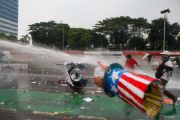 Pengunjukrasa berusaha menghindari semprotan air dari water canon yang dilakukan polisi untuk membubarkan sejumlah pengunjuk rasa saat Hari Buruh Internasional di depan Gedung DPR, Jakarta, Kamis (1/5/2025). Kepolisian melakukan pembubaran paksa terhadap pengunjuk rasa sekitar pukul 17.15 WIB dengan menggunakan water cannon dan kendaraan barikade. ANTARA FOTO/Fathul Habib Sholeh/foc.