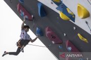 Atlet panjat tebing Indonesia Ravianto Ramadhan menuruni papan panjat dinding usai mengikuti babak kualifikasi kategori lead putra seri ketiga IFSC Climbing World Cup 2025 di Pulau Peninsula, Nusa Dua, Bali, Jumat (2/5/2025). Dalam babak kualifikasi tersebut tiga atlet Indonesia Putra Tri Ramadani, Raviandi Ramadhan dan Muhammad Rizky Syahrafli Simatupang berhasil lolos ke babak semifinal. ANTARA FOTO/Bayu Pratama S/Spt.