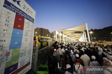 Jamaah calon haji Indonesia antre menunggu kedatangan bus Shalawat di Terminal Shib Amir, kawasan Masjidil Haram, Makkah, Arab Saudi, Selasa (20/5/2025). Terminal bus tersebut melayani 14 rute dari hotel-hotel jamaah calon haji Indonesia yang terletak di kawasan Syisyah dan Raudhah menuju Masjidil Haram dan sebaliknya. ANTARA FOTO/Andika Wahyu/agr