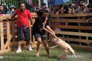 Peserta menangkap seekor babi hutan saat lomba tangkap babi pada Pekan Gawai Dayak ke-39 di Rumah Radakng, Pontianak, Kalimantan Barat, Jumat (23/5/2025). Dalam lomba tersebut setiap peserta harus menggunakn kain penutup mata, dan hanya mengandalkan insting serta pendengaran untuk menangkap babi yang dilepas di arena. ANTARA FOTO/Jessica Wuysang/Spt.