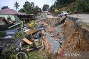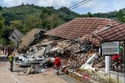 Kondisi bangunan yang runtuh akibat longsor di Desa Kendan, Kecamatan Nagreg, Kabupaten Bandung, Jawa Barat, Senin (19/5/2025). Longsor yang terjadi pada Minggu 18/5 malam tersebut mengakibatkan kompleks kantor dan fasilitas desa serta satu rumah warga rusak berat dan tiga orang mengalami luka-luka. ANTARA FOTO/Raisan Al Farisi/tom.
