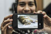 Petugas Balai KSDA Jambi menunjukkan foto harimau sumatra (Panthera tigris sumatrae) yang terluka akibat terjerat tali sling saat konferensi pers di Kantor Balai KSDA Jambi, Jambi, Jumat (23/5/2025). Menurut Balai KSDA Jambi kondisi harimau sumatra berjenis kelamin jantan berumur sekitar lima tahun yang ditemukan terluka akibat jerat tali sling pada kaki kiri depan di area HTR Bungo Pandan, Tebo pada Selasa (13/5) itu saat ini terus membaik setelah dilakukan upaya medis dan perawatan lanjutan di TPS Balai KSDA Jambi. ANTARA FOTO/Wahdi Septiawan/tom.