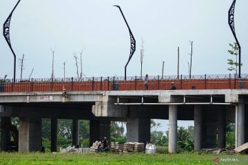 Pekerja menyelesaikan pembangunan pagar Jembatan Pandansimo di Bantul, DI Yogyakarta, Rabu (4/6/2025). Jembatan Pandansimo sebagai penghubung Jalur Jalan Lintas Selatan (JJLS) antara Kabupaten Kulonprogo dan Bantul sepanjang 1,9 kilometer tersebut sudah mencapai 98 persen memasuki tahap akhir dan pemasangan ornamen gunungan. ANTARA FOTO/Hendra Nurdiyansyah/foc.