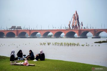 Warga bersantai di sekitar kawasan pembangunan Jembatan Pandansimo di Bantul, DI Yogyakarta, Rabu (4/6/2025). Jembatan Pandansimo sebagai penghubung Jalur Jalan Lintas Selatan (JJLS) antara Kabupaten Kulonprogo dan Bantul sepanjang 1,9 kilometer tersebut sudah mencapai 98 persen memasuki tahap akhir dan pemasangan ornamen gunungan. ANTARA FOTO/Hendra Nurdiyansyah/foc.