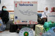 Petugas menimbang kargo jamaah haji yang akan pulang ke Indonesia di Hotel Moro Alalameyah, Makkah, Arab Saudi, Kamis (12/6/2025). Sebagian jamaah haji memanfaatkan jasa kargo untuk mengirimkan barang belanjaan mereka ke tanah air yang bertarif 22 riyal per kg dengan masa pengiriman 14-21 hari. ANTARA FOTO/Andika Wahyu/nz