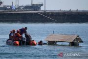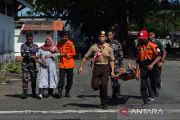 Tim gabungan dari TNI AL, TNI AD, BPBD dan Basarnas mengevakuasi korban banjir saat simulasi penanganan bencana di Markas Komando Lantamala VI Makassar, Sulawesi Selatan, Kamis (19/6/2025). Simulasi tersebut sebagai bentuk kesiapsiagaan dan kordinasi tim gabungan dalam mengantisipasi apabila terjadi bencana khususnya banjir yang kerap melanda wilayah Kota Makassar. ANTARA FOTO/Hasrul Said/rwa.