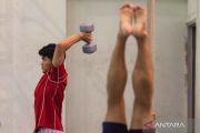 Atlet senam artistik putra Agung Akbar melakukan pemanasan saat pemusatan latihan nasional (pelatnas) di Sport Jabar Arcamanik, Bandung, Jawa Barat, Selasa (15/7/2025). Sebanyak lima atlet putra senam artistik menjalani latihan untuk peningkatan kemampuan sebagai persiapan Kejuaraan Dunia Gimnastik Artistik 2025 dan Sea Games 2025. ANTARA FOTO/Novrian Arbi/nym.