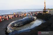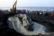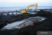 Petugas menggunakan alat berat mengubur bangkai paus sperma (Physeter macrocephalus) yang mati dan terdampar di pantai Desa Sletreng, Kapongan, Situbondo, Jawa Timur, Minggu (27/7/2025). Petugas dan relawan mengubur bangkai paus tersebut di tepi pantai karena telah membusuk. ANTARA FOTO/Seno/sgd