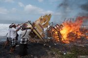 Umat Hindu membakar sarana upacara saat rangkaian upacara Baligia Bukhur di Pantai Masceti, Gianyar, Bali, Senin (28/7/2025). Upacara yang digelar Puri Saren Kangin Keramas tersebut dilakukan setelah upacara pelebon atau ngaben berskala besar terhadap tokoh puri setempat yang terakhir kali dilaksanakan pada tahun 1995 itu untuk penyucian terhadap roh leluhur atau keluarga yang telah meninggal dunia supaya mendapatkan tempat yang lebih baik di alam baka. ANTARA FOTO/Nyoman Hendra Wibowo/foc.