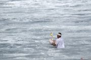 Umat Hindu membawa sarana upacara ke tengah laut saat rangkaian upacara Baligia Bukhur di Pantai Masceti, Gianyar, Bali, Senin (28/7/2025). Upacara yang digelar Puri Saren Kangin Keramas tersebut dilakukan setelah upacara pelebon atau ngaben berskala besar terhadap tokoh puri setempat yang terakhir kali dilaksanakan pada tahun 1995 itu untuk penyucian terhadap roh leluhur atau keluarga yang telah meninggal dunia supaya mendapatkan tempat yang lebih baik di alam baka. ANTARA FOTO/Nyoman Hendra Wibowo/foc.
