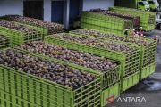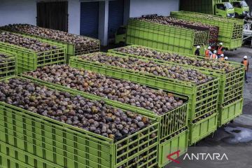 Sejumlah truk mengangkut buah kelapa untuk dimasukkan ke dalam pabrik di PT. Natural Indococonut Organik (NICO) Desa Kupa-Kupa Tobelo Selatan, Kabupaten Halmahera Utara, Maluku Utara, Jumat (1/8/2025). PT NICO pabrik kelapa yang terintegrasi di Tobelo Selatan itu memiliki kapasitas produksi sekitar 600.000 butir kelapa per hari untuk dijadikan berbagai jenis olahan produk kelapa seperti santan kelapa, santan coconut creamer, santan mama koko dan air kelapa dan setiap bulan hasil produksinya mencapai 300 ton yang kemudian diekspor ke Cina, Korea, Canada, Australia, Hongaria Jerman dan Belanda. ANTARA FOTO/Andri Saputra/rwa.
