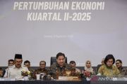 Menteri Koordinator Bidang Perekonomian Airlangga Hartarto (ketiga kiri) bersama (dari kiri) Menteri Investasi dan Hilirisasi/Kepala Badan Koordinasi Penanaman Modal (BKPM) Rosan Perkasa Roeslani, Menteri PPN/Kepala Bappenas Rachmat Pambudy, Menteri Keuangan Sri Mulyani Indrawati, Menteri Pariwisata Widiyanti Putri Wardhana, Menteri Perdagangan Budi Santoso, dan Kepala Badan Gizi Nasional Dadan Hindayana sebelum mengikuti konferensi pers pertumbuhan ekonomi kuartal II-2025 di Kantor Kemenko Perekonomian, Jakarta, Selasa (5/8/2025). Menteri Koordinator Bidang Perekonomian mengatakan ekonomi Indonesia tumbuh sebesar 5,12 persen pada kuartal II-2025 secara tahunan (year on year). ANTARA FOTO/Dhemas Reviyanto/nz
