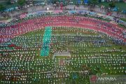 Foto udara sejumlah pelajar mengikuti Senam Anak Indonesia Hebat di Stadion Benteng Reborn, Kota Tangerang, Banten, Jumat (8/8/2025). Kegiatan yang diikuti 10.000 pelajar dengan tujuan untuk menanamkan gaya hidup sehat sejak dini tersebut mencetak rekor dari Museum Rekor-Dunia Indonesia (MURI). ANTARA FOTO/Putra M. Akbar/nym.