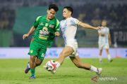 Pesepak bola PSIM Yogyakarta Reva Adi Utama (kanan) berebut bola dengan pesepak bola Persebaya Surabaya Toni Firmansyah pada pertandingan Super League 2025/2026 di Stadion Gelora Bung Tomo, Surabaya, Jawa Timur, Jumat (8/8/2025). PSIM Yogyakarta berhasil mengalahkan tuan rumah Persebaya Surabaya dengan skor 1-0. ANTARA FOTO/Rizal Hanafi/sgd
