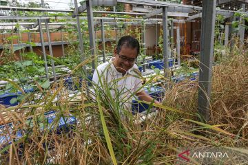 Pemilik kebun hidroponik Anis Fuad Salam (62) membersihkan gulma yang tumbuh di sekitar tanaman padi di Fans Hydro, Taktakan, Kota Serang, Banten, Kamis (11/9/2025). Pemilik memanfaatkan sebagian lahan di pekarangan rumahnya untuk menguji coba inovasi budi daya tanaman padi jenis gogo dengan metode hidroponik yang dapat menghasilkan sebanyak 15-20 kilogram beras dari sekitar 800-1.000 bibit dalam satu kali panen selama 70 hari, di mana hal tersebut dilakukan guna mendukung ketahanan pangan keluarga serta mengedukasi masyarakat. ANTARA FOTO/Angga Budhiyanto/nz