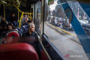 Sejumlah warga menggunakan transportasi publik bus Transjakarta di Jakarta, Jumat (12/9/2025). Gubernur DKI Jakarta Pramono Anung menyampaikan Jakarta menempati peringkat ke-17 dari 50 kota terbaik di dunia dalam bidang transportasi publik pada tahun 2025 melalui 18 ribu responden yang disurvei oleh lembaga survei internasional Time Out. ANTARA FOTO/Bayu Pratama S/YU