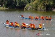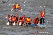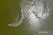 Sejumlah peserta beradu kecepatan saat mengikuti balap perahu di Sungai Bengawan Solo, Lamongan, Jawa Timur, Minggu (14/9/2025). Lomba yang merupakan rangkaian dari Festival Dayung Tejosari itu diikuti 40 tim dari berbagai kota se-Jawa Timur, di antaranya Pasuruan, Sidoarjo, Bojonegoro, Tuban, dan Lamongan dengan tujuan untuk melestarikan tradisi sekaligus sebagai sarana warga untuk bersilaturahmi. ANTARA FOTO/Muhammad Mada/tom.