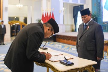 Presiden Prabowo Subianto (kanan) menyaksikan Kepala Kantor Staf Kepresidenan M Qodari (kiri) menandatangani dokumen pada acara pelantikan Menteri dan Wakil Menteri Negara Kabinet Merah Putih Dalam Sisa Masa Jabatan Periode Tahun 2024-2029 di Istana Negara, Jakarta, Rabu (17/9/2025). Presiden Prabowo Subianto melantik sejumlah pejabat pemerintahan diantaranya Menteri Koordinator Bidang Politik dan Keamanan Djamari Chaniago, Menteri Pemuda dan Olahraga Erick Thohir, Wakil Menteri Ketenagakerjaan Afriansyah Noor, Wakil Menteri Kehutanan Rohmat Marzuki, Wakil Menteri Koperasi Faridah Faridjah, Kepala Badan Komunikasi Pemerintah Angga Raka Prabowo dan Kepala Kantor Staf Kepresidenan M Qodari. ANTARA FOTO/Muhammad Adimaja/foc.