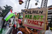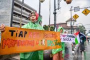 Massa aksi yang tergabung dalam Solidaritas Seni Untuk Palestina membentangkan poster saat mengikuti aksi di depan Monumen Dasasila Bandung di Jalan Asia Afrika, Bandung, Jawa Barat, Jumat (19/9/2025). Dalam aksinya mereka mengajak masyarakat untuk menyalakan alarm secara bersama-sam sebagai bentuk protes terhadap tindakan Israel yang telah membunuh anak-anak di Palestina. ANTARA FOTO/Raisan Al Farisi/bar