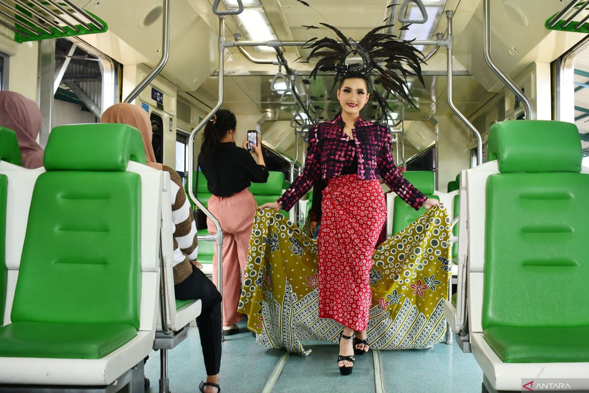 Model memeragakan busana batik di dalam kereta saat transit pada peringatan Hari Batik Nasional di Stasiun Kereta Api Madiun, Jawa Timur, Kamis (2/10/2025). PT KAI Daerah Operasi 7 Madiun menggelar peringatan hari batik nasional dengan menampilkan peragaan busana batik untuk mengangkat citra batik sebagai warisan budaya. ANTARA FOTO/Siswowidodo/foc.