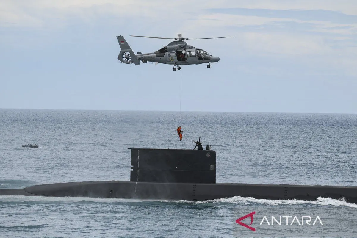 Helikopter Bell 412 EP Puspenerbal menurunkan prajurit ke kapal selam KRI Alugoro (405) saat Sailing Pass di perairaan Teluk Jakarta, Kamis (2/10/2025). Parade yang diikuti 51 kapal perang tersebut digelar dalam rangka peringatan HUT Ke-80 TNI. ANTARA FOTO/Hafidz Mubarak A/tom.