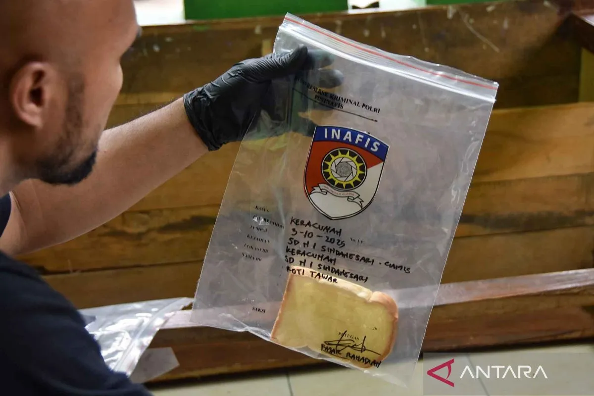 Personel Inafis dan Tipidter mengambil sampel Makan Bergizi Gratis (MBG) di SD Negeri 1 Sindangsari, Kabupaten Ciamis, Jawa Barat, Jumat (3/10/2025). Polres Ciamis telah melakukan penanganan dugaan keracunan Makan Bergizi Gratis dengan menu makan berisi roti tawar, keju slice, bubur kacang, santan, dan puding buah, yang mengakibatkan 16 siswa mengalami keracunan. ANTARA FOTO/Adeng Bustomi/nym.