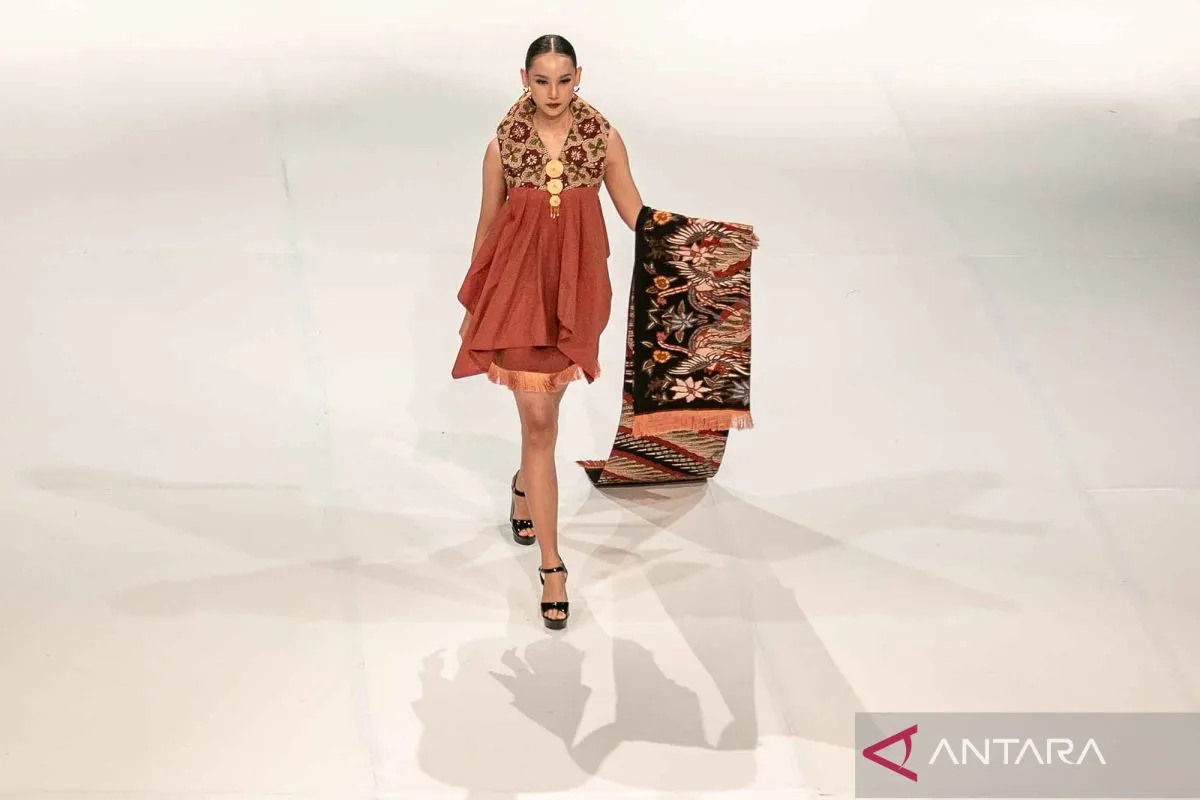 Model membawakan busana bertema batik karya perancang Uzy Fauziyah pada acara Solo Batik Fashion 2025 di Taman Balekambang, Solo, Jawa Tengah, Jumat (3/10/2025). Acara peragaan busana yang mengangkat tema batik dari masa ke masa tersebut sebagai wadah desainer lokal mengenalkan dan mengembangkan busana batik sebagai inspirasi batik di masa mendatang sekaligus upaya mengajak masyarakat mencintai batik sebagai warisan budaya bangsa. ANTARA FOTO/Mohammad Ayudha/YU