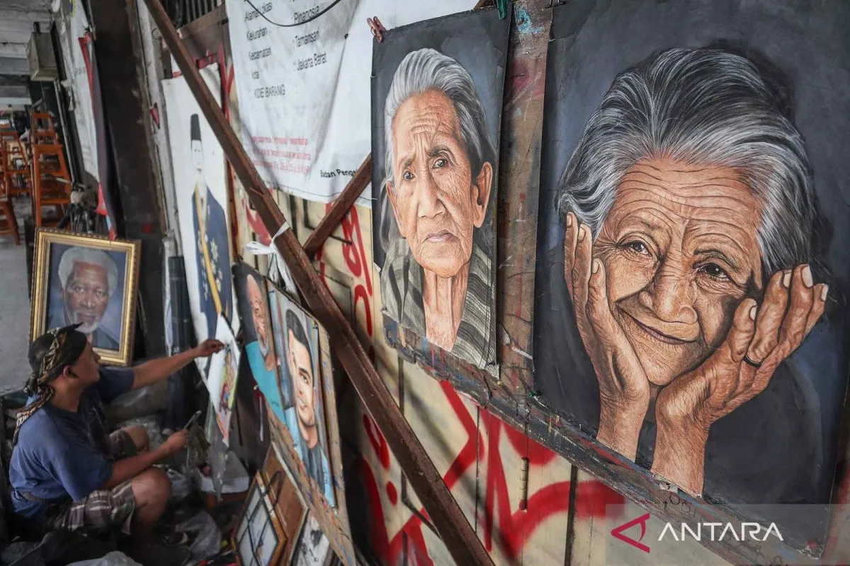Pelukis Wastro menyelesaikan karya lukisannya di trotoar Jalan Pintu Besar Selatan, Jakarta, Jumat (3/10/2025). Pelukis jalanan sejak 2010 dan tergabung dalam kelompok pelukis kota itu mampu memproduksi sekitar 10 lukisan per hari dengan harga jual dari Rp350 ribu hingga Rp5 juta serta pernah menerima pesanan dari Presiden Prabowo Subianto. ANTARAFOTO/Muhammad Rizky Febriansyah/YU