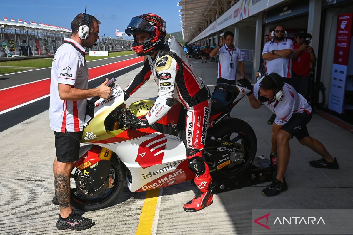 Pembalap Idemitsu Honda Team Asia asal Indonesia Mario Aji (kedua kiri) bersiap mengikuti sesi latihan bebas 2 Moto2 Indonesia 2025 di Sirkuit Internasional Pertamina Mandalika, Lombok Tengah, Nusa Tenggara Barat, Sabtu (4/10/2025). Latihan bebas 2 tersebut diikuti Mario sebagai persiapan menjelang kualifikasi Moto2 Indonesia. ANTARAFOTO/Aditya Pradana Putra/agr