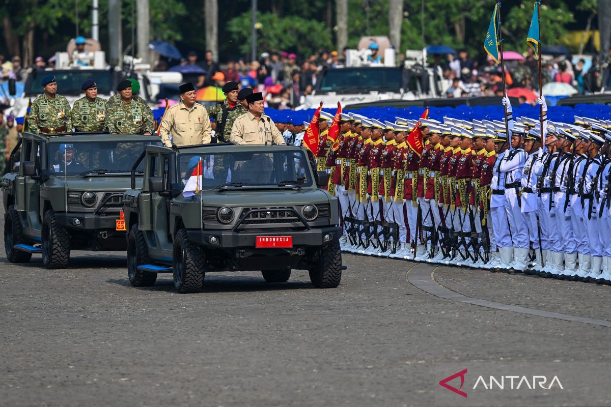 Presiden Prabowo Subianto (kanan, atas) didampingi Menteri Pertahanan Sjafrie Sjamsoeddin (ketiga kanan, atas), Panglima TNI Jenderal TNI Agus Subiyanto (kedua kanan, atas) melaksanakan inspeksi pasukan dalam upacara HUT ke-80 TNI di kawasan Silang Monas, Jakarta, Minggu (5/10/2025). Pada peringatan usianya yang ke-80 ini TNI mengangkat tema besar TNI Prima, TNI Rakyat, Indonesia Maju. ANTARA FOTO/Asprilla Dwi Adha/sgd