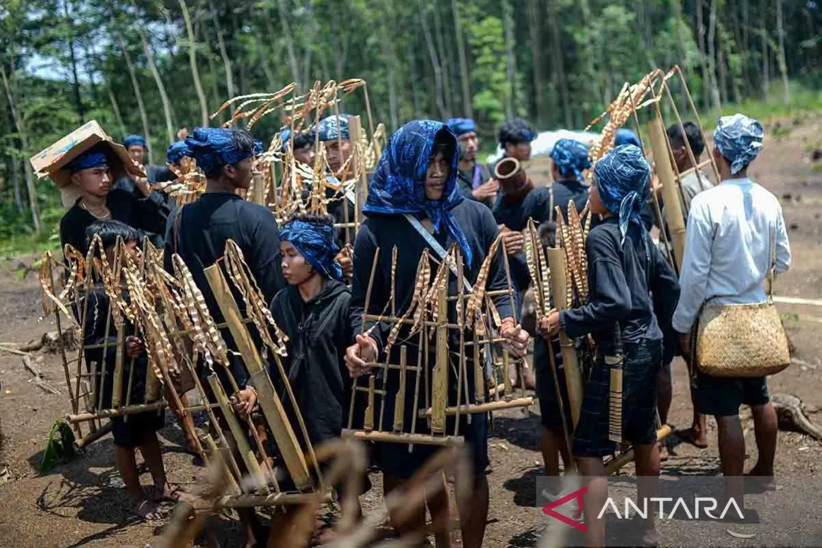 Warga Suku Badui memainkan musik Angklung Buhun saat prosesi tradisi Ngaseuk di Cibengkuang, Lebak, Banten, Minggu (5/10/2025). Tradisi Ngaseuk merupakan ritual tahunan Suku Badui yang biasa dilaksanakan pada bulan Oktober-November dalam menanam padi gogo di huma atau ladang kering guna memenuhi kebutuhan pangan. ANTARA FOTO/Muhammad Bagus Khoirunas/rwa.