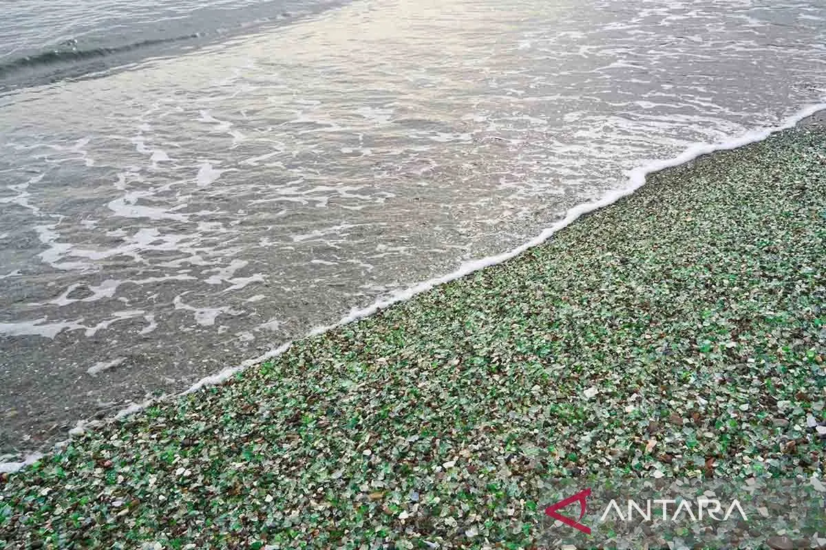 Penampakan pecahan kaca di Glass Beach, Vladivostok, Rusia, Minggu (5/10/2025). Glass Beach yang terletak di Teluk Ussuri di pinggiran Vladivostok dulunya merupakan tempat pembuangan barang pecah belah bekas yang setelah puluhan tahun tersapu oleh laut dan terpoles menjadi kerikil halus berwarna-warni dan menciptakan garis pantai yang menarik banyak wisatawan. ANTARA FOTO/Xinhua/Guo Feizhou/rwa.