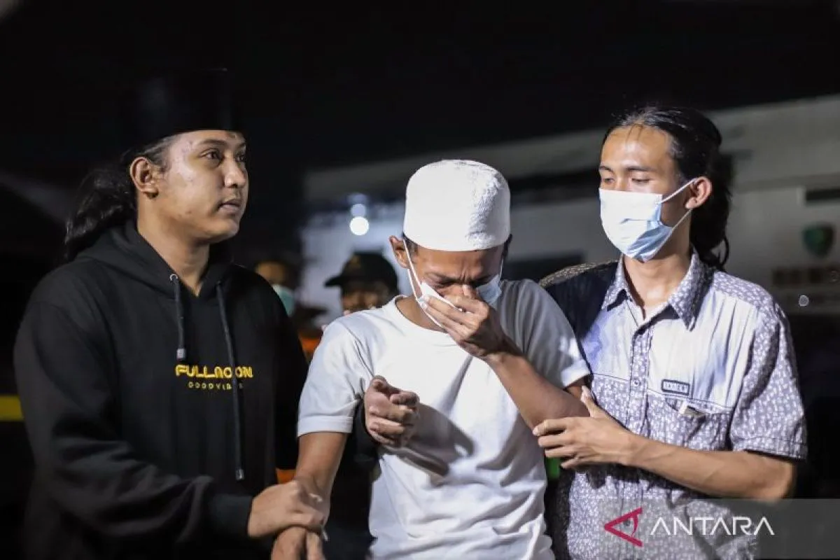 Keluarga menangis usai menyaksikan jenazah korban runtuhnya bangunan mushala Pondok Pesantren (Ponpes) Al Khoziny di Rumah Sakit Bhayangkara H.S. Samsoeri Mertojoso, Surabaya, Jawa Timur, Senin (6/10/2025). Menurut data Disaster Victim Investigation (DVI) Polda Jatim hingga Senin (6/10) pukul 20.00 WIB, telah berhasil mengidentifikasi 17 korban dari 59 kantong jenazah dan semua korban yang teridentifikasi telah diserahkan ke keluarganya. ANTARA FOTO/Rizal Hanafi/sgd