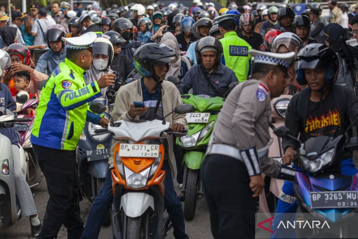 Sejumlah pengendara sepeda motor terjaring razia pajak dan kelengkapan kendaraan bermotor di Batam, Kepulauan Riau, Kamis (9/10/2025). Razia gabungan tersebut bertujuan untuk meningkatkan kesadaran dan kedisiplinan masyarakat dalam memenuhi kewajiban pajak kendaraan bermotor serta tertib administrasi berkendara. ANTARA FOTO/Teguh Prihatna/sgd