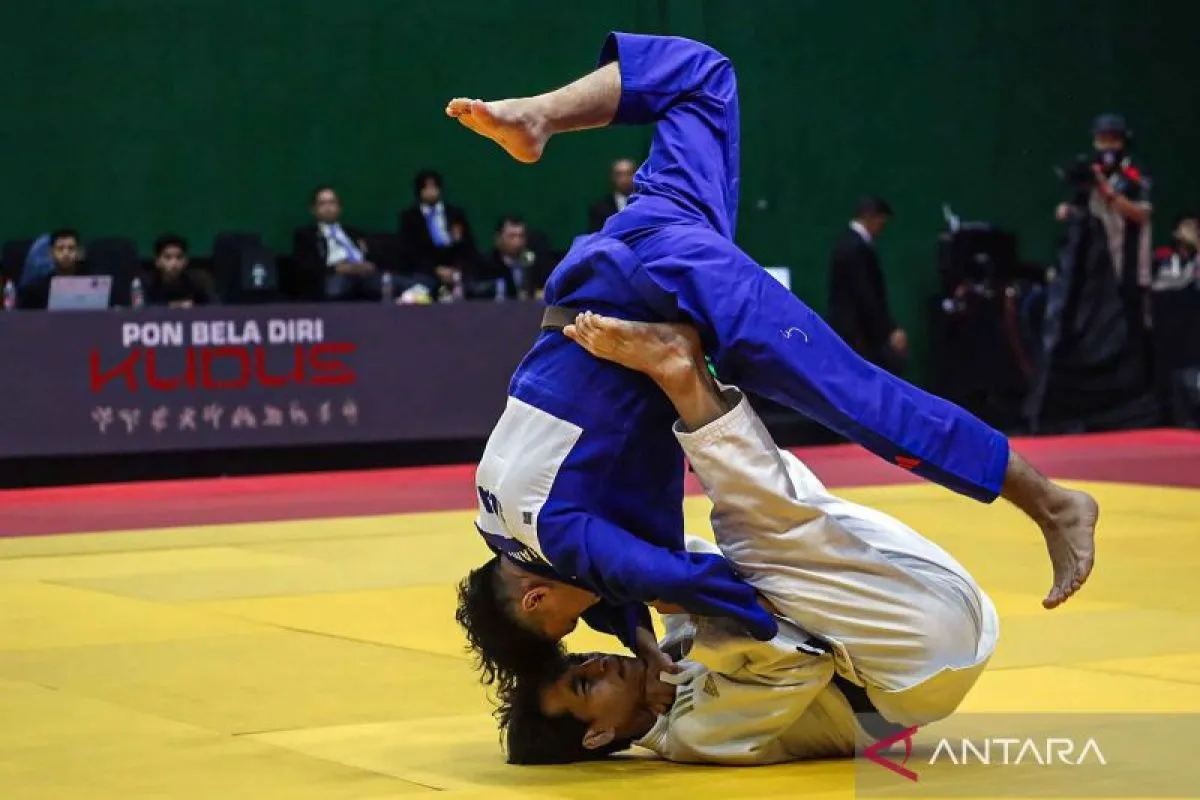 Judoka Kalimantan Timur Elman Valentino Siaha (atas) berusaha mengunci judoka Banten Haryo Yudha Pratama (bawah) pada babak perempat final nomor -55 kg putra Pekan Olahraga Nasional (PON) Bela Diri 2025 di Djarum Arena, Kudus, Jawa Tengah, Minggu (12/10/2025). Sebanyak 2.656 atlet dari 38 provinsi di Indonesia mengikuti pertandingan yang terbagi dalam 10 nomor olahraga bela diri pada pelaksanaan perdana PON Bela Diri 2025 di Kabupaten Kudus. ANTARA FOTO/Makna Zaezar/YU