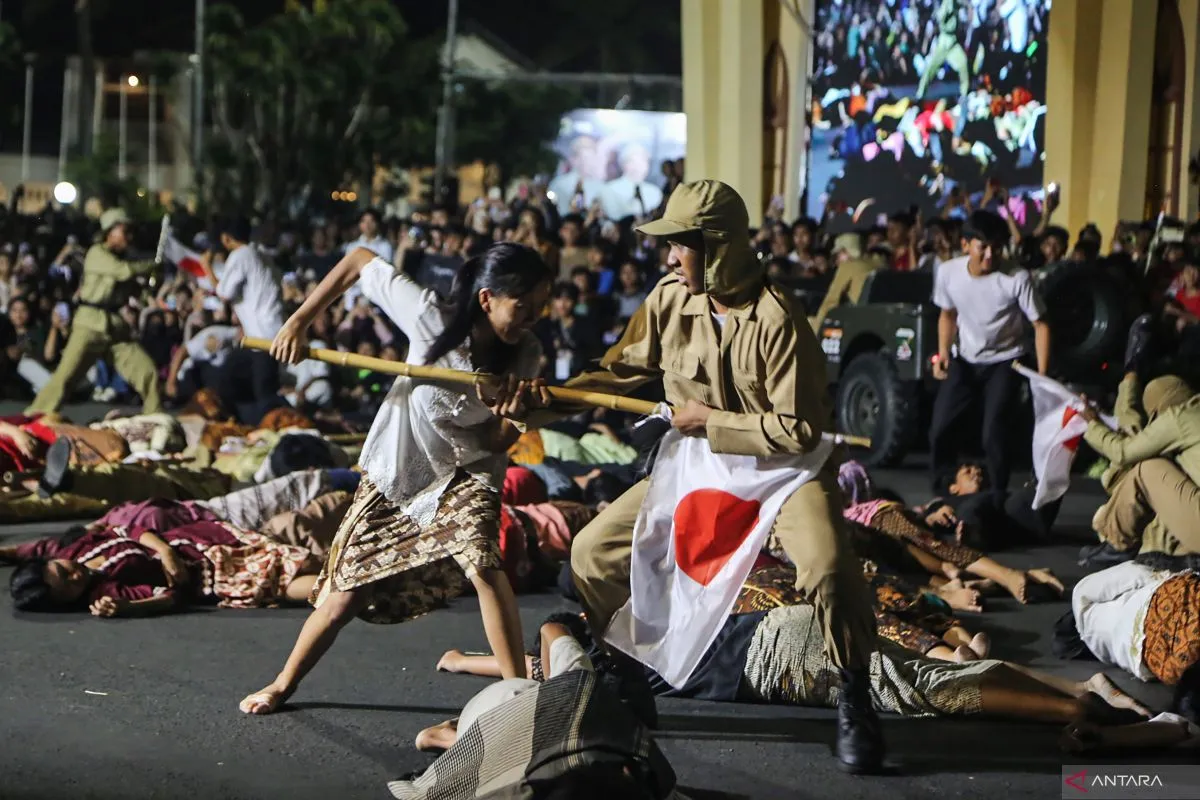 Sejumlah pemain memerankan tentara Jepang saat bersiap bertempur dengan pejuang pemuda Indonesia dalam drama teatrikal peringatan Pertempuran Lima Hari Semarang (PLHS) di depan Tugu Muda, Semarang, Jawa Tengah, Selasa (14/10/2025). Drama teatrikal dan upacara yang melibatkan 1.900 peserta dari unsur TNI, Polri, Pramuka, Tagana, karang taruna, pelajar SMA/SMK, serta berbagai komunitas seni di kota tersebut mengisahkan tentang PLHS pada Oktober 1945 di kawasan Tugu Muda antara pemuda pejuang melawan tentara Jepang yang menewaskan ratusan orang dari kedua belah pihak. ANTARA FOTO/Makna Zaezar/foc.