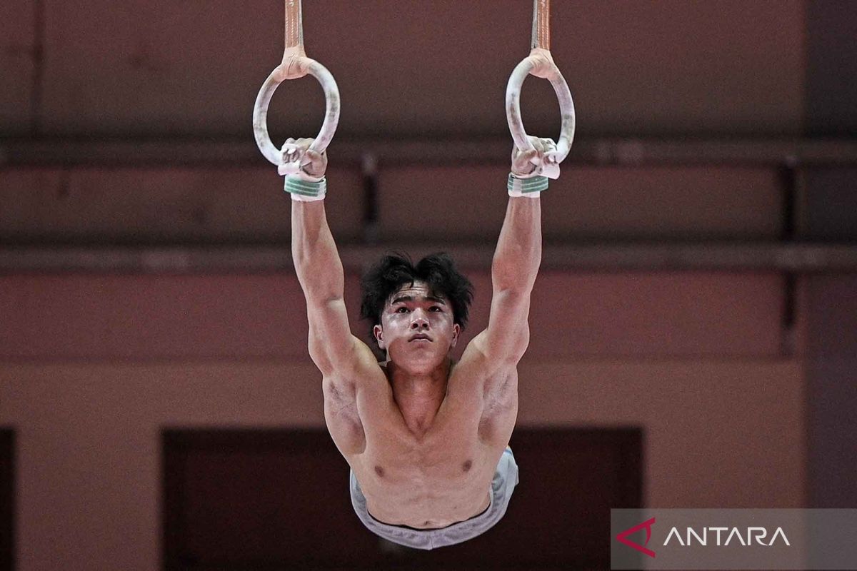 Pesenam putra Jepang Shinnosuke Oka berlatih saat sesi latihan Kejuaraan Dunia Gimnastik 2025 atau 53rd FIG Artistic Gymnastics World Championships 2025 di Jakarta Convention Center (JCC), Jakarta, Rabu (15/10/2025). Sejumlah pesenam mulai melakukan sesi latihan sebelum bertanding dalam 53rd FIG Artistic Gymnastics World Championships 2025 pada 19-25 Oktober 2025 di Indonesia Arena, Jakarta. ANTARA FOTO/Fauzan/YU