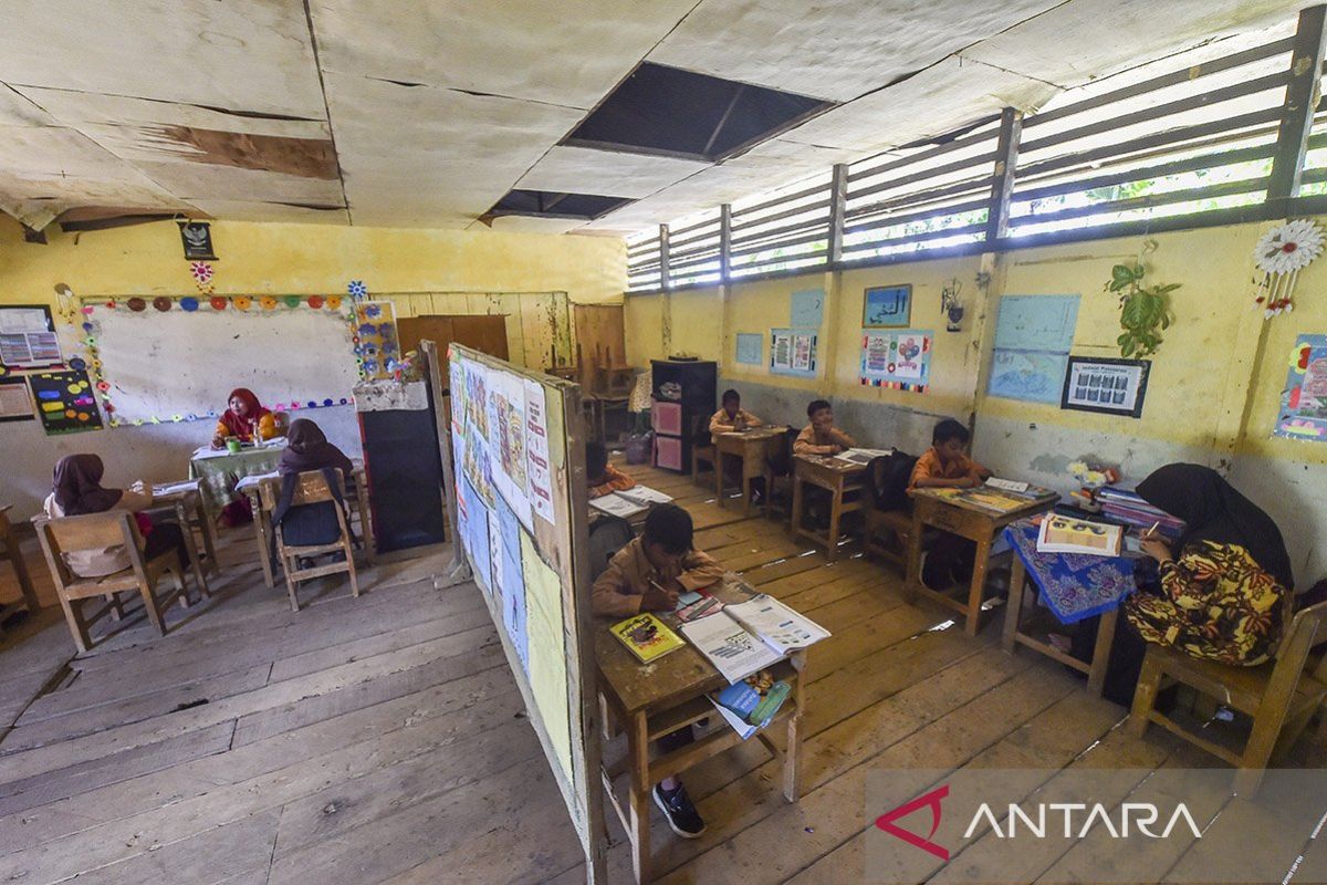 Guru kelas V (kanan) dan kelas VI (kiri) mengajar di ruang kelas yang disekat menggunakan tripleks di SDN 94 Lagan Ulu, Geragai, Tanjung Jabung Timur, Jambi, Kamis (16/10/2025). Sekolah yang saat ini memiliki 37 murid di salah satu perkampungan tua di Tanjung Jabung Timur itu dalam kondisi rusak pada plafon dan lantai sehingga membahayakan guru dan siswa, serta telah 33 tahun lebih melakukan kegiatan belajar mengajar dengan cara disekat untuk empat rombongan belajar. ANTARA FOTO/Wahdi Septiawan/rwa.