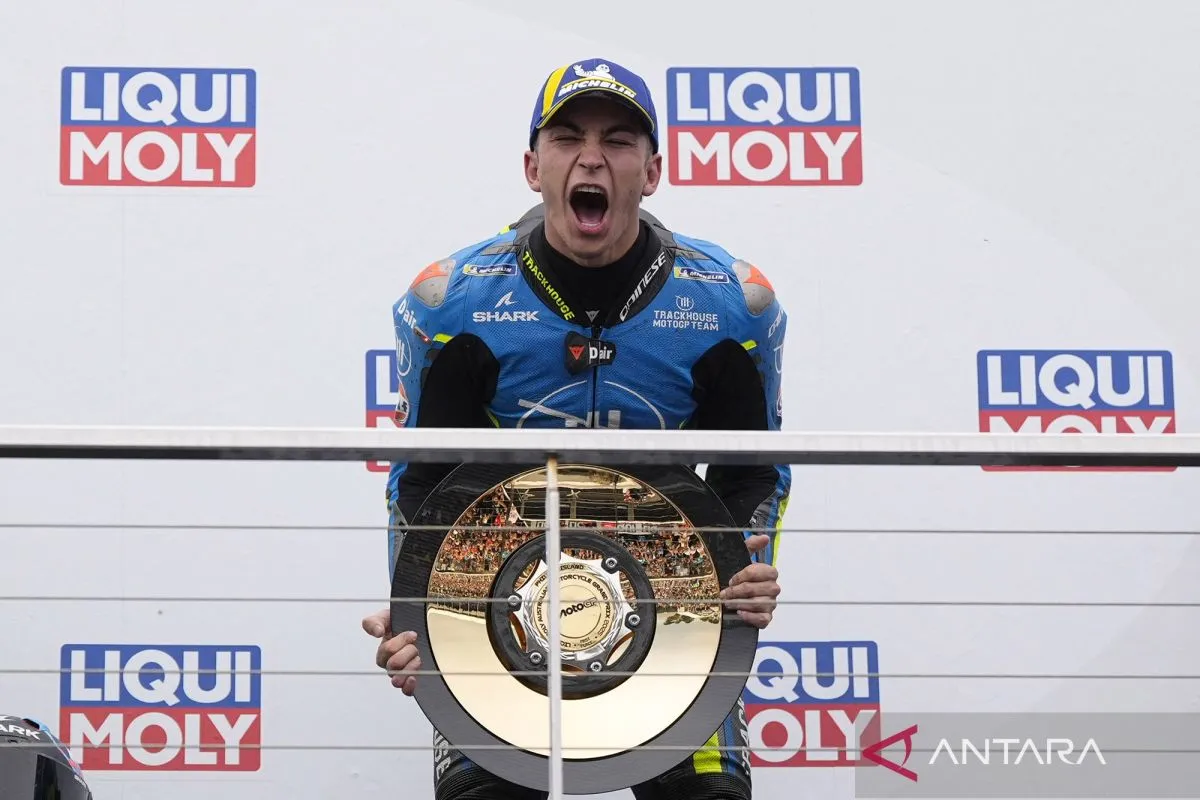 Pembalap Trackhouse MotoGP Team Raul Fernandez merayakan kemenangan dengan trofi usai MotoGP Australia 2025 di Sirkuit Grand Prix Phillip Island, Phillip Island, Australia, Minggu (19/10/2025). Raul Fernandez menyentuh garis finis di MotoGP Australia usai 27 lap balapan dengan catatan waktu 39 menit 49,571 detik. ANTARA FOTO/REUTERS/Asanka Brendon Ratnayake/agr