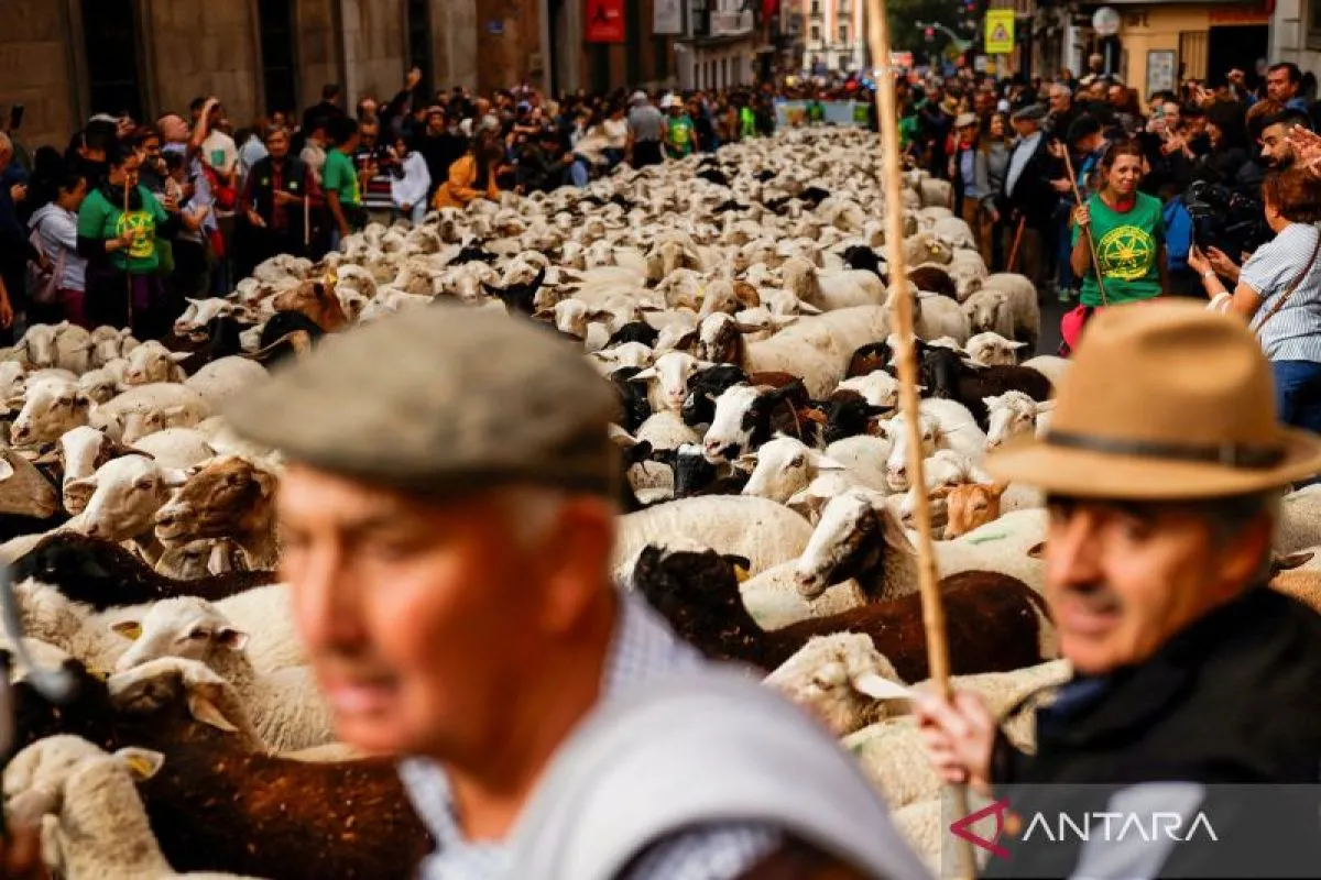Ratusan domba berjalan di pusat kota Madrid saat Festival Migrasi Domba di Madrid, Spanyol, Minggu (19/10/2025). Festival yang telah berlangsung selama berabad-abad tersebut merupakaan sebagai bagian dari peringatan tradisi kuno para penggembala untuk memindahkan ternak dari padang rumput musim panas ke padang rumput musim dingin. ANTARA FOTO/REUTERS/Alejandro Martinez Velez/agr