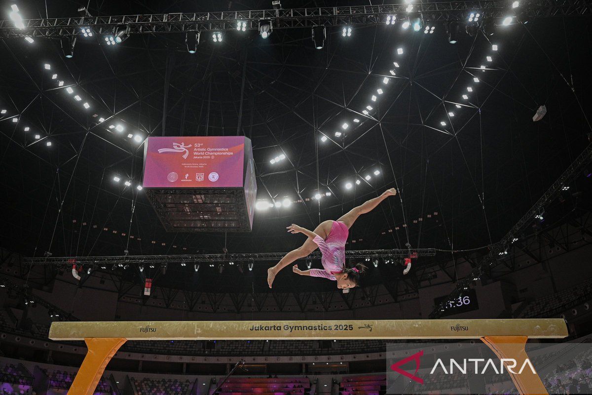 Pesenam putri Indonesia Salsabilla Hadi Pamungkas berlatih saat sesi latihan Kejuaraan Dunia Gimnastik 2025 atau 53rd FIG Artistic Gymnastics World Championships 2025 di Indonesia Arena, Jakarta, Sabtu (18/10/2025). Pesenam putri Indonesia menjalani sesi latihan resmi jelang Kejuaraan Dunia Gimnastik 2025 sebelum bertanding pada 19-25 Oktober 2025 di Indonesia Arena. ANTARA FOTO/Fauzan/tom.