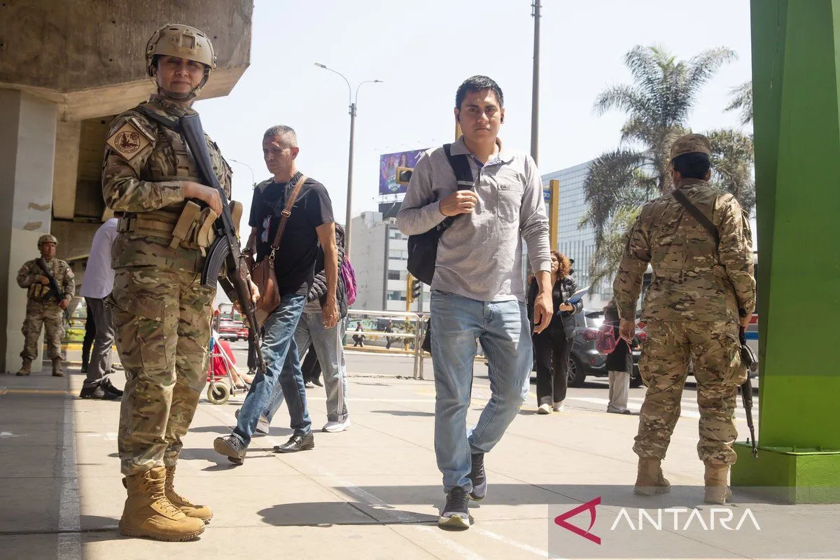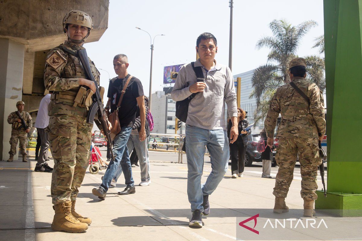 Prajurit wanita berpatroli di Stasiun Metro La Cultura di Lima, Peru, Rabu (22/10/2025) waktu setempat. Presiden Peru Jose Jeri pada Selasa (21/10) mengumumkan keadaan darurat selama 30 hari untuk ibu kota Lima dan wilayah tetangga Callao guna mengatasi memburuknya keamanan publik, sementara kabinet telah menyetujui dekret untuk memberlakukan langkah darurat. ANTARA FOTO/Xinhua/Mariana Bazo/tom.