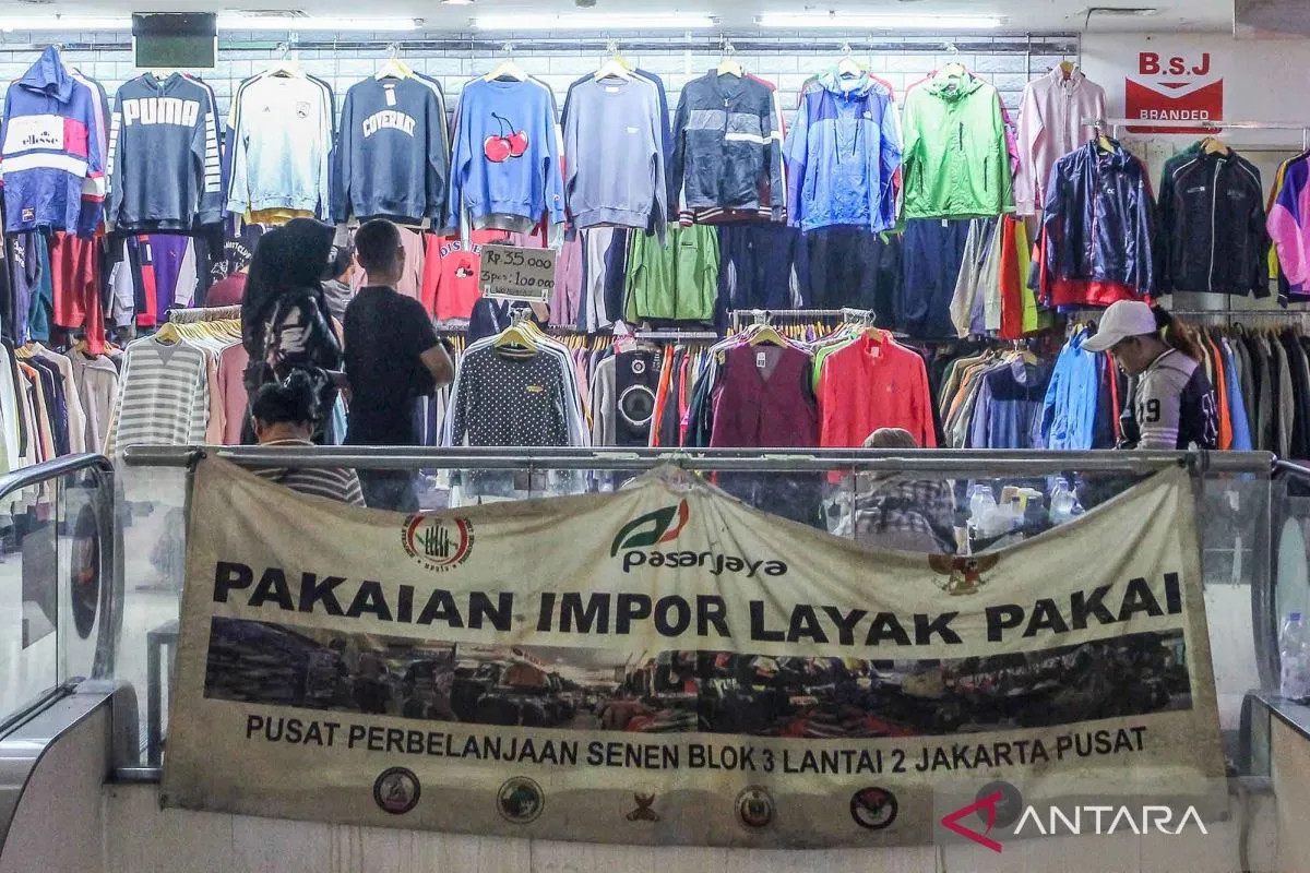 Calon pembeli melihat pakaian bekas yang dijual di Pasar Senen, Jakarta, Jumat (24/10/2025). Menteri Keuangan Purbaya Yudhi Sadewa mengatakan pihaknya akan melarang praktik impor bal pakaian bekas ilegal dalam karung atau balpres karena dapat merugikan negara dan beresiko terhadap kesehatan sekaligus sebagai upaya pemerintah untuk melindungi industri tekstil dalam negeri. ANTARA FOTO/Naufal Khoirulloh/nym.