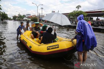 Sejumlah warga menggunakan perahu karet untuk melintasi banjir yang merendam Jalan Raya Tambakrejo, Kelurahan Kaligawe, Semarang, Jawa Tengah, Sabtu (25/10/2025). Berdasarkan data BPBD Kota Semarang per Sabtu (25/10) sebanyak 8.180 jiwa dari 3.324 KK di 10 kelurahan dan delapan titik jalan raya di kota itu masih terdampak banjir dengan ketinggian bervariasi dari 10-60 centimeter akibat intensitas hujan tinggi yang masih melanda sejak Selasa (21/10). ANTARA FOTO/Makna Zaezar/sgd