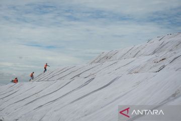 Pekerja berjalan di atas tumpukan sampah yang dilapisi dengan tanah dan geotextile di TPA Jatiwaringin KabupatenTangerang, Banten, Jumat (24/10/2025). Kementerian Lingkungan Hidup meminta seluruh TPA yang masih menggunakan sistem open dumping di wilayah Jabodetabek untuk segera melakukan capping atau penutupan tumpukan sampah guna mencegah pencemaran lingkungan dan penyebaran mikroplastik. ANTARA FOTO/Putra M. Akbar/rwa.